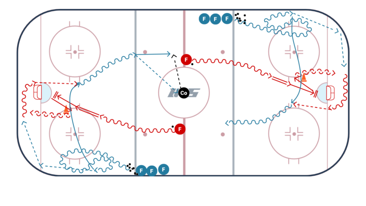 For the 1st rep the blue and red players will go on the whistle in the same time. We start at each sides of the ice to make it continuous. Once the 1st rep done, blue players will go when the red one reached the neutral zone’s red line.