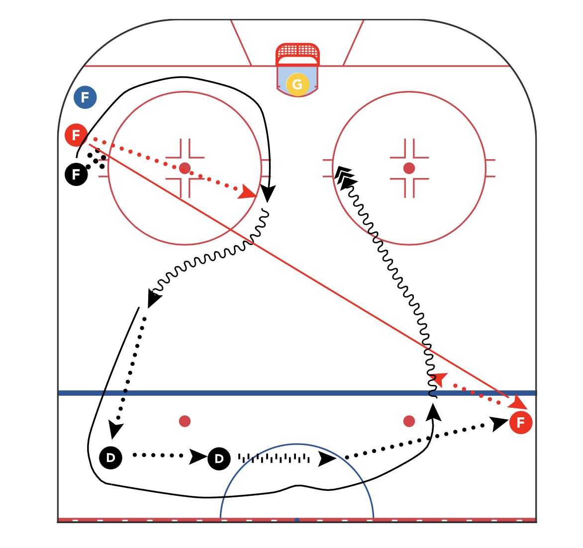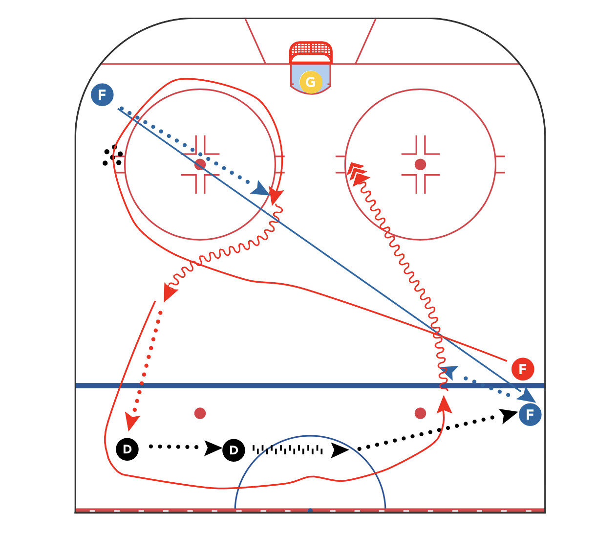 Right after Red makes the pass, they skate hard to the far corner of the blue line to receive a pass from whichever defender has the puck, they should ensure they catch this pass on-side as the Black player skates behind the defense gaining speed, before entering the zone and getting a pass from Red who is posted up.