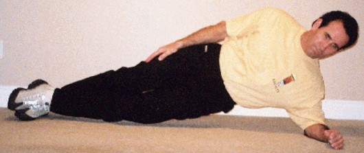 1. Front Plank – Bent elbows under shoulders, balancing on toes, with body straight, abs contracted to maintain neutral spine. Head in a neutral position. Modified plank – same exercise done on the knees. Advanced plank exercises: 1) move elbows forward, 2) lift one arm forward in the air, or 3) balance on opposite elbow and leg. Hold for 30-counts and do 2 – 3 sets.