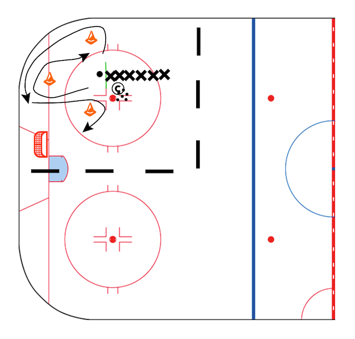 Skating below the first cone they then go above the third cone. At the third cone the player picks up a puck then turns towards the net to shoot.