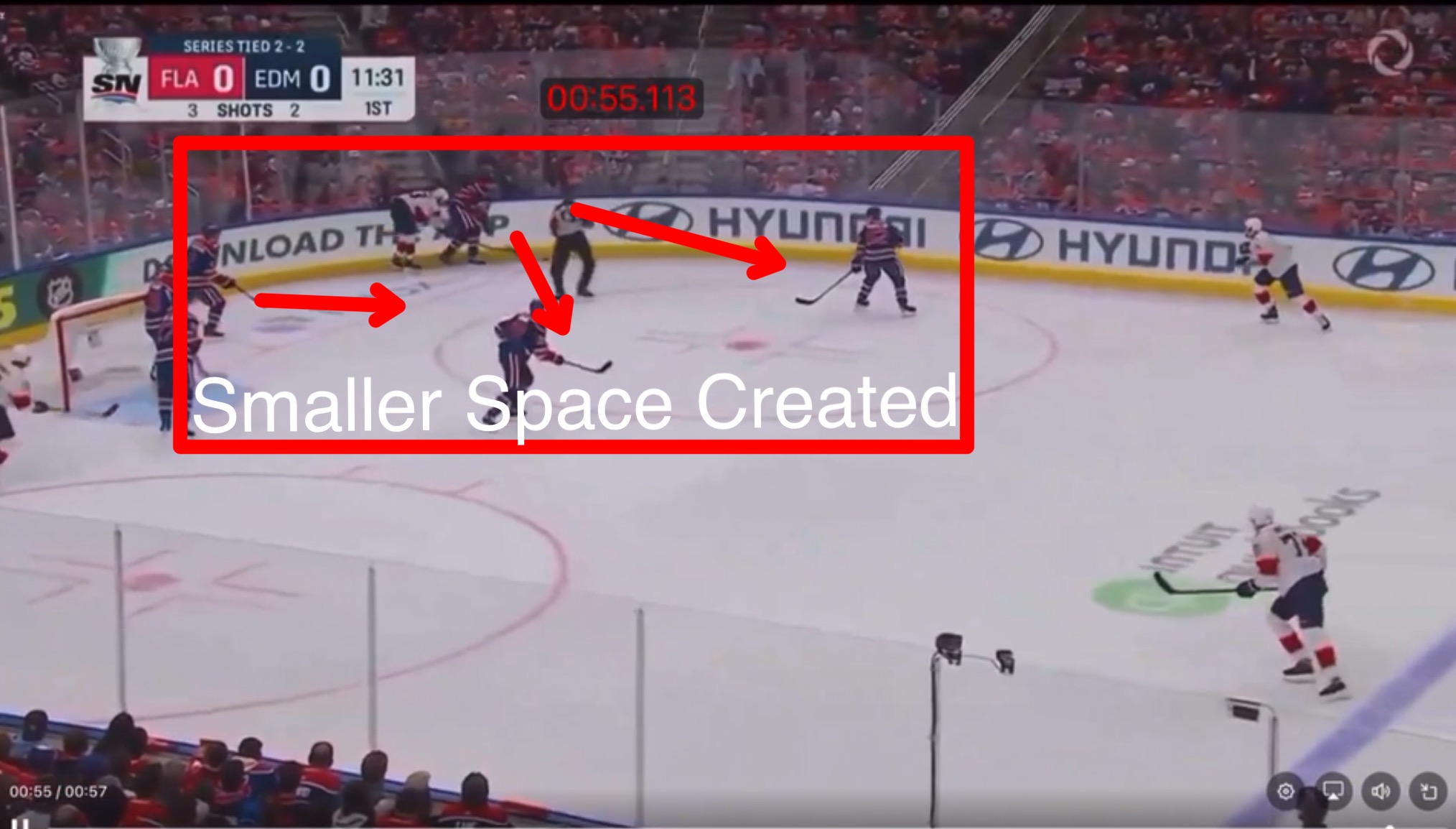 At the end of the 56 seconds in the OZ Florida Forwards were tired and started to come off the ice which allowed Edmonton to pressure up on a puck strong side with numbers to create the smaller space to defend and to win the puck and exit the zone. The Edmonton DMAN got body and stick position on the defender and moved the puck into middle ice support to exit the zone. The contraction of the ice by the OILERS was done at the end of the shift when there were many opportunities to regain puck possession to exit the zone.