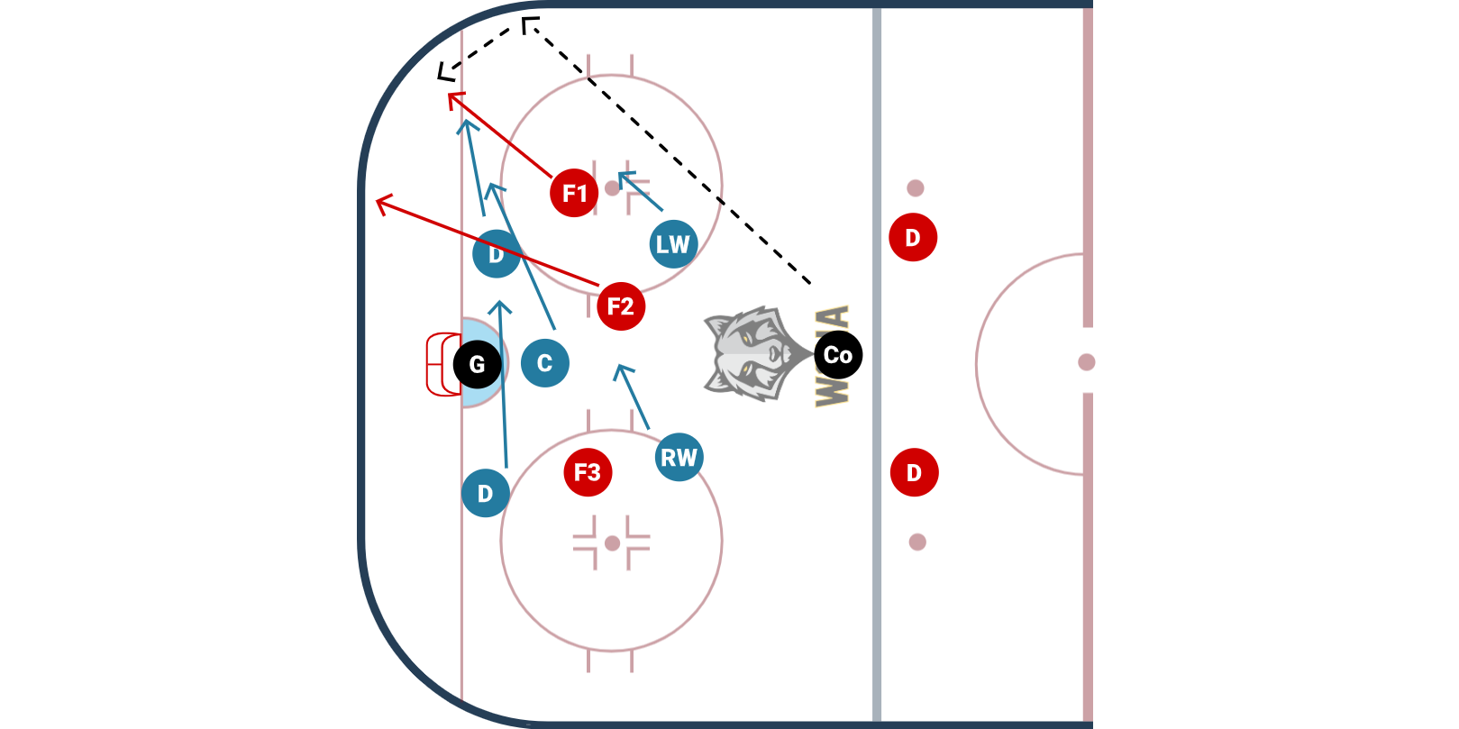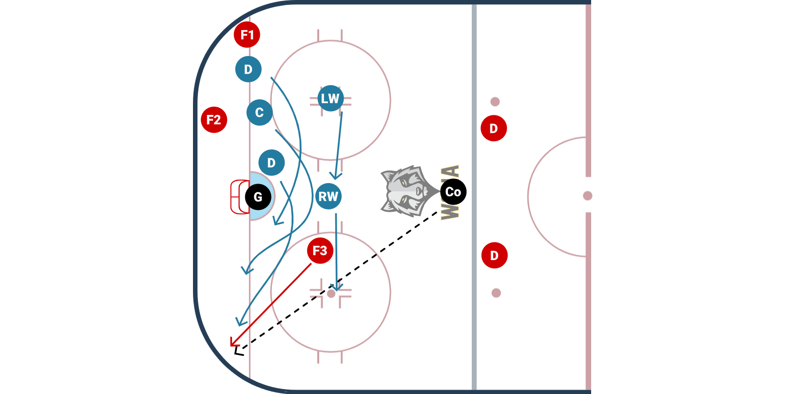 - The defensive team will have to kill the play off of F3, get the puck, breakout, and attack on the two D in the neutral zone