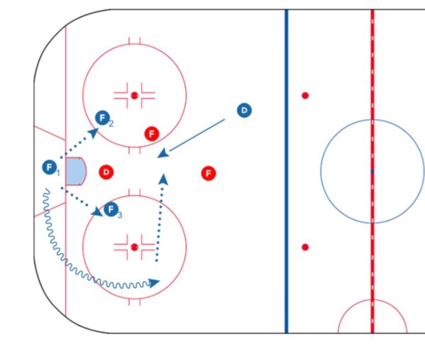 It is a simple 3 on 3 drill. Since our team identity is aggression, I want my defencemen to be a part of the forecheck and the O-zone. So this means I will add a defenseman to the drill. The defenseman is to find openings and do dive downs to create scoring opportunities and smother the zone.