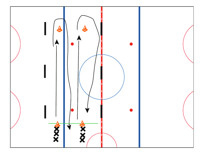 At the cone players turn and skate back to their line.