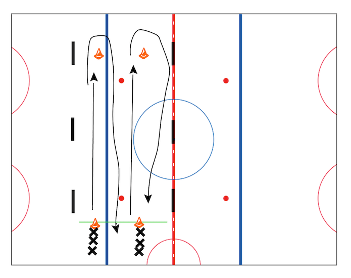 Coach draws lines on the ice to designate starting point for the players and places a cone at the far side of the ice inline with the player line.