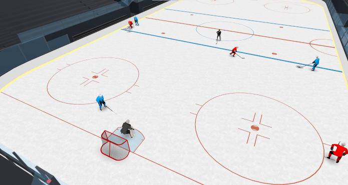 - D1 pivots backwards as D2 chips puck low behind him to the corner.