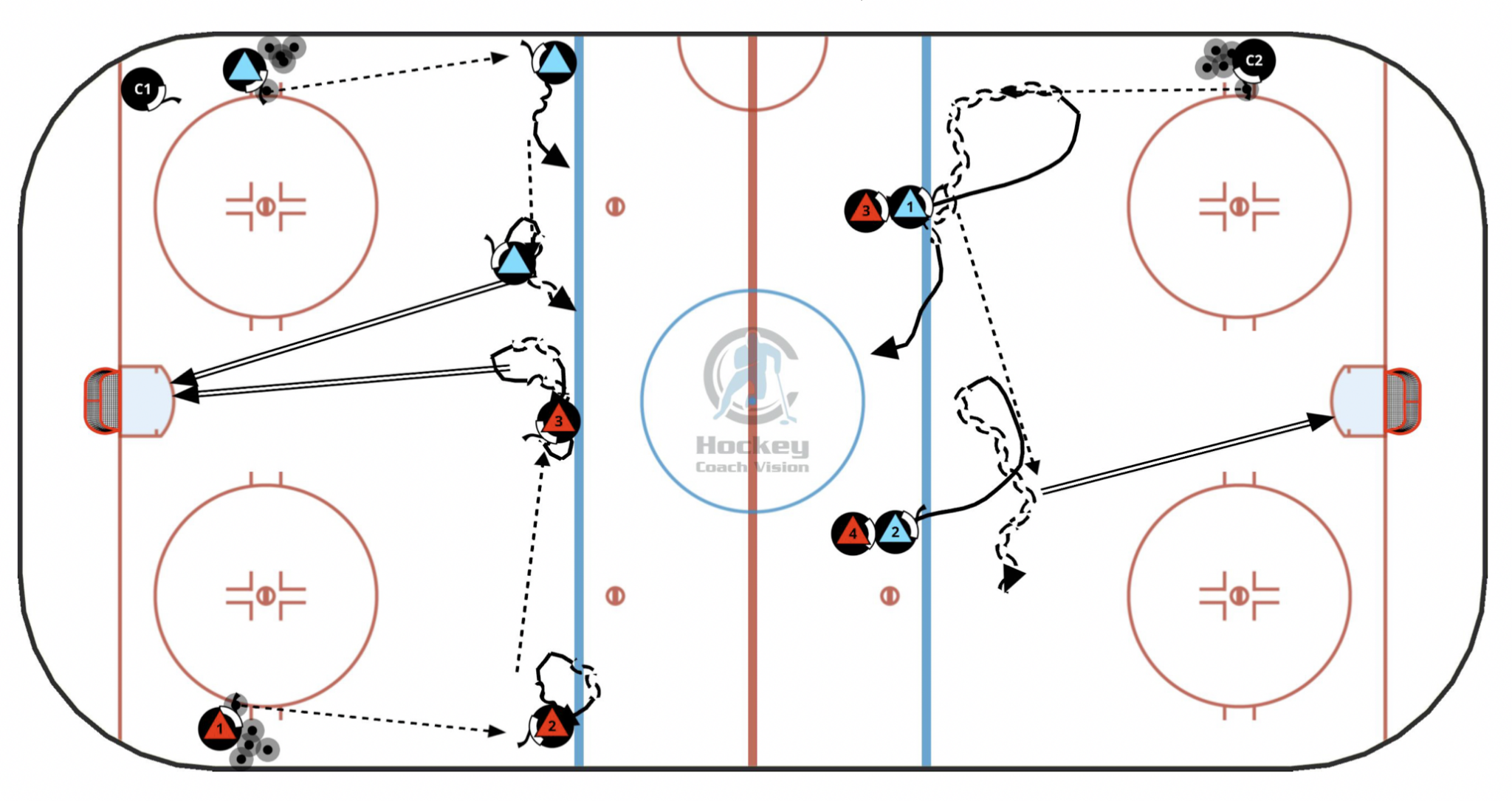 C2: D take and make passes in movement moving laterally along the blue line. Start with D to D pass and quick release shot then progress to sliding along the blue line before passing back to D at the middle of the blue line for a quick release shot.