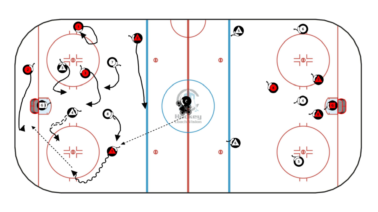 This PP small area game allows game like competition in a very small space. Defenders and goalies get a chance to score as well!