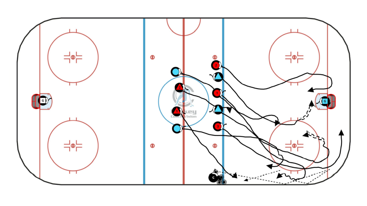 The drill starts with a chip by the Coach to create a 3v2 battle for the puck as PK forwards and PP D men enter the zone to create 5vs4.