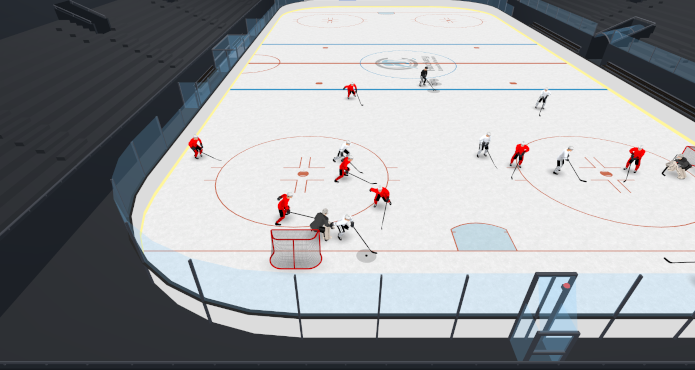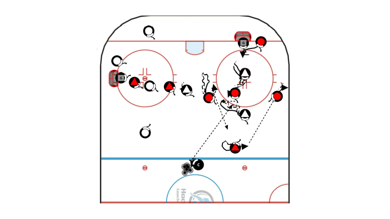 Coach starts play by passing to the attacking players on either side to start 5v2 play. If defenders recover a loose puck, they move it quickly to their attacking unit on the other side. If the puck is frozen by the goalie, goes out over the blue line or a goal is scored, the Coach throws in a new puck to the opposite side.