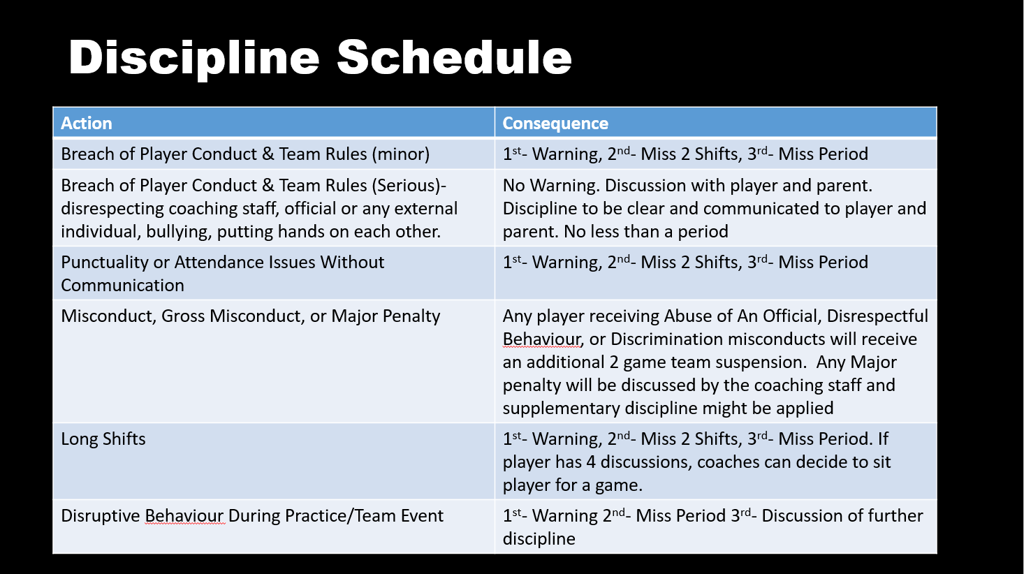 The single most important thing you can do as a coach is set the expectations in stone as early as you can. For those of you who have checked out my Post Tryout Meeting article, I lay it out right away in the first meeting what the expectations are. Outlining acceptable and not acceptable behaviour is important but whats even more important is communication what the consequence is for the not acceptable behaviour. Here is an outline of Action/Consequence that I share with PLAYERS AND PARENTS in the first meeting of the season.