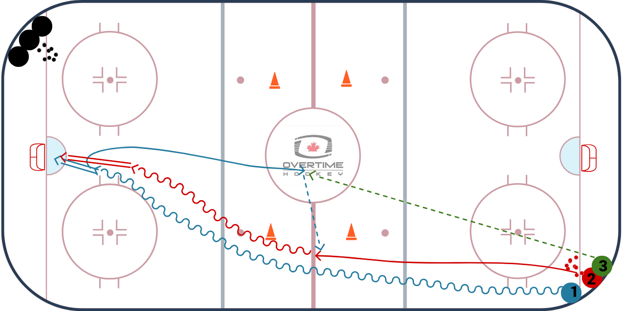 - Player 1 leaves with a puck and skates down to shoot on net, after shot they turn back down ice and receive a pass from the line