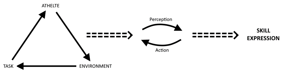interpreting this diagram we see that the interaction of athlete, task and environment constraints results in a continous cycle of perception and action which then results in the expression of skill. In other words, players to perceive affordances based on the interacting constraints and act accordingly to solve problems. These actions are viewed as an expression of skill.