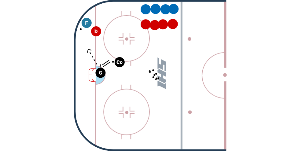 So we begin the drill with the goalie starting in a sprawled position. He is lying flat on his stomach, leg extended, and rather than pushing the puck into the corner, the coach fires a puck of the goalie's pad, which rebounds into the corner. The goalie now has to recover to their feet, find their post, and the drill continues exactly as it would elsewise.