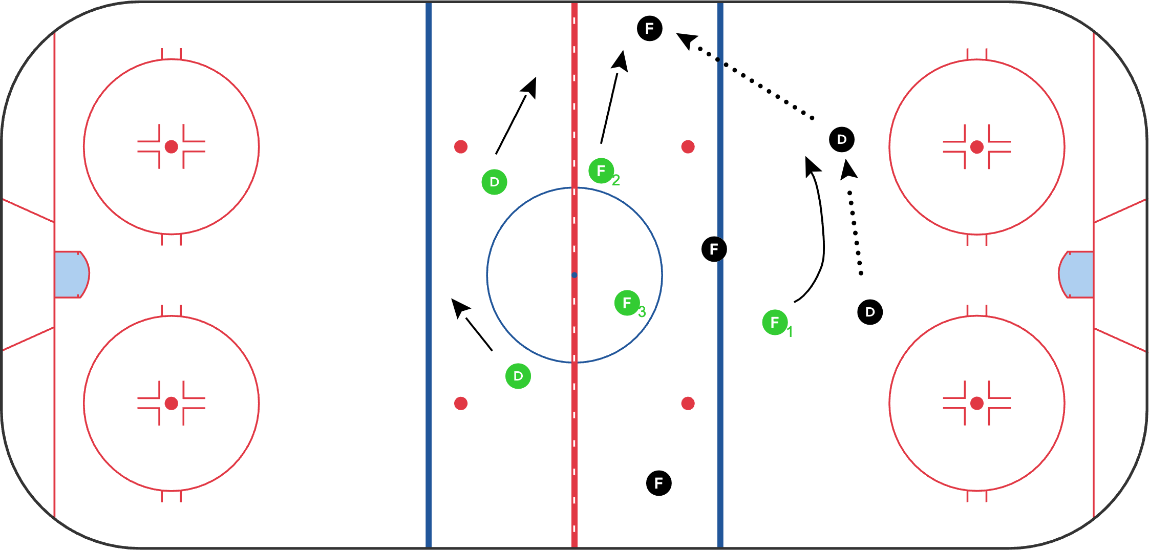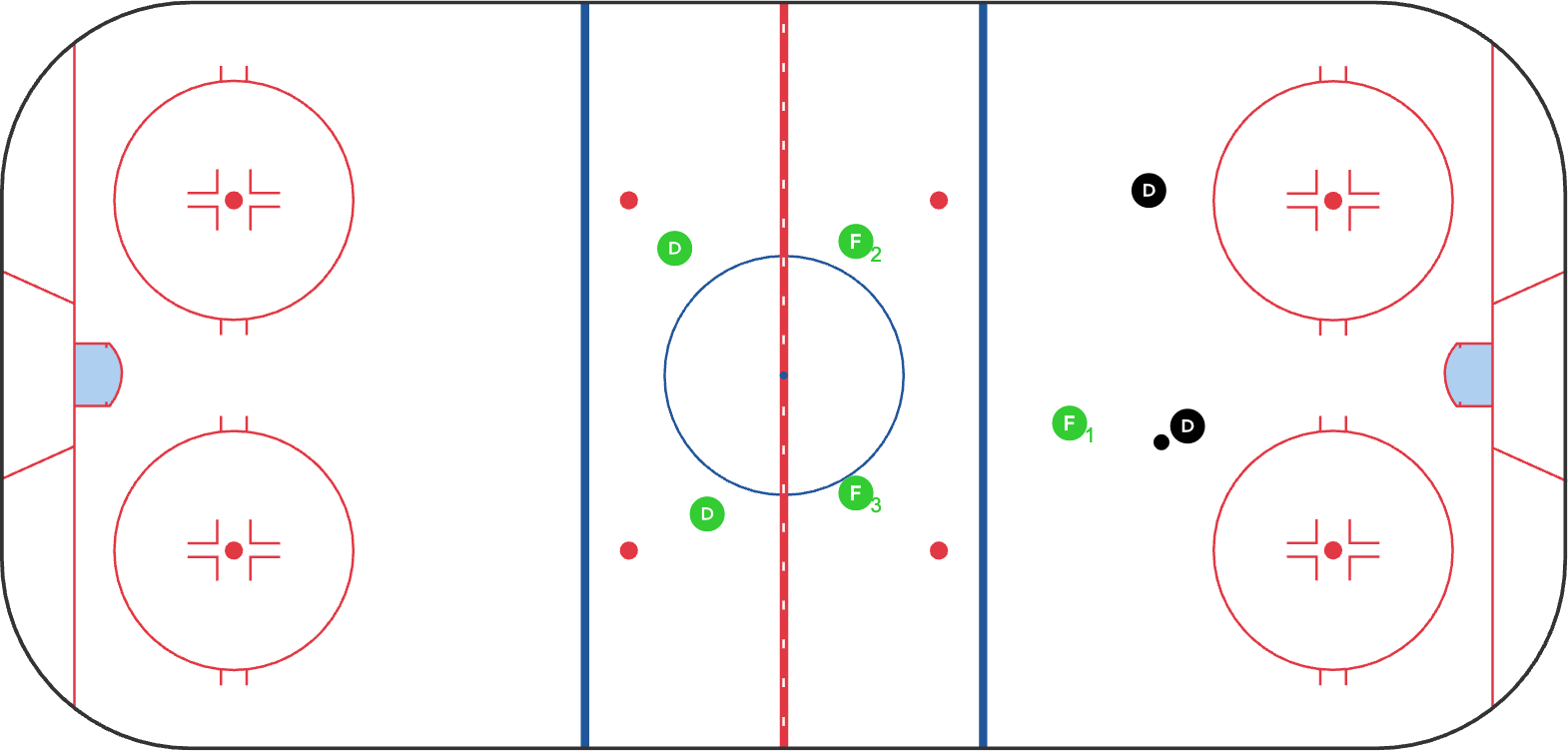 - The defensemen maintain gap control and are positioned to defend against zone entries or retrieve dump-ins