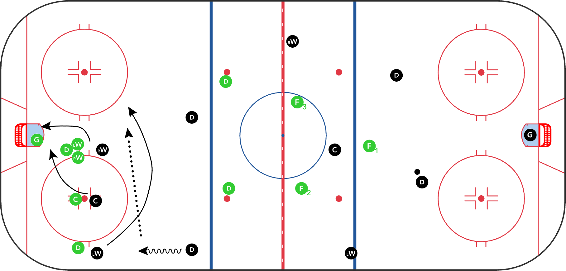 Here’s a drill you can use to practice this forecheck. It starts with a faceoff win, so your players will really be primed for a game-like situation.