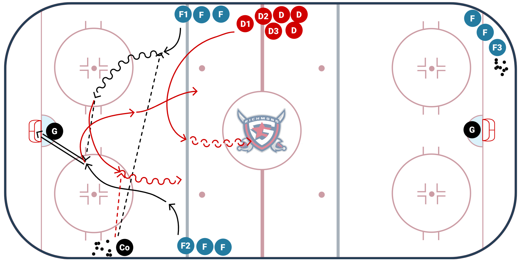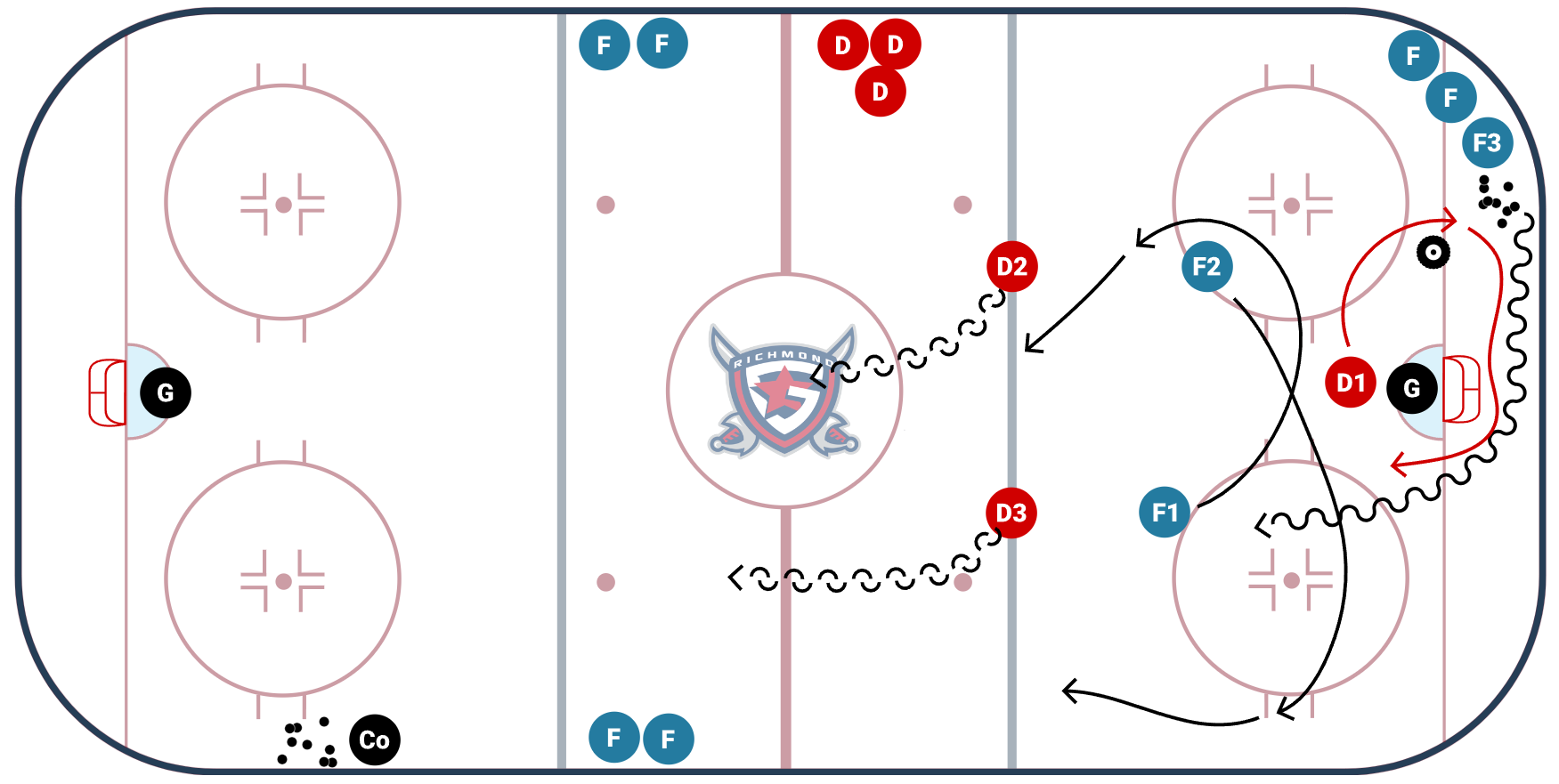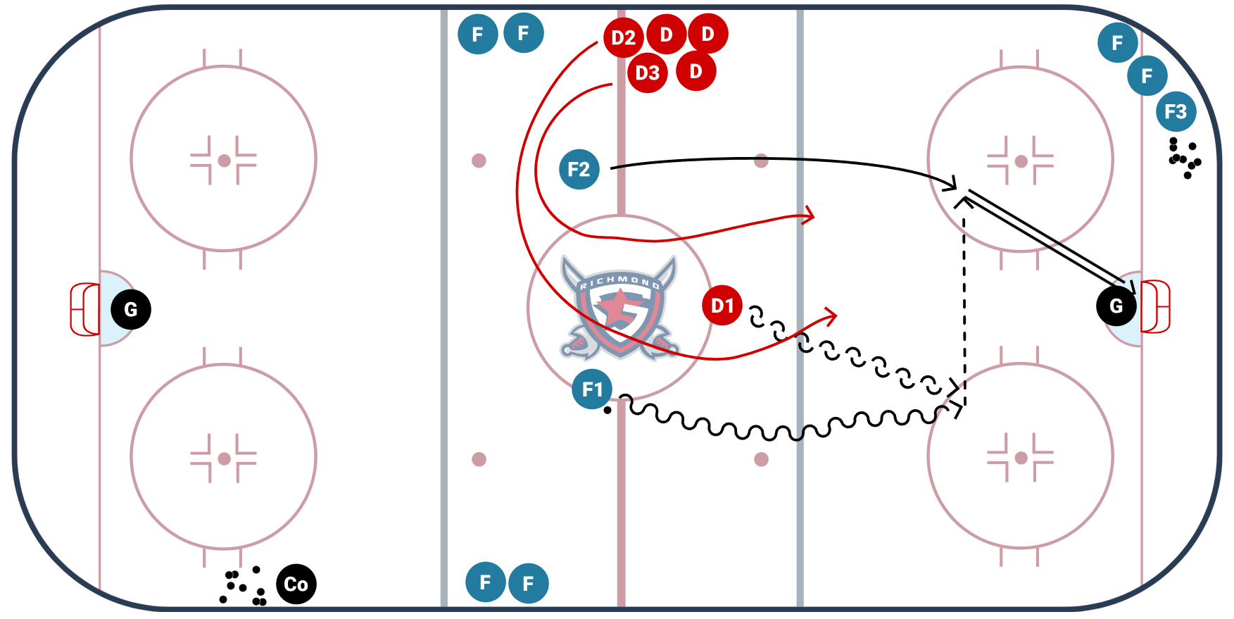 - After the shot F1 and F2 swing with their momentum and recieve a second puck from coach to initiate a 2 on 1 rush