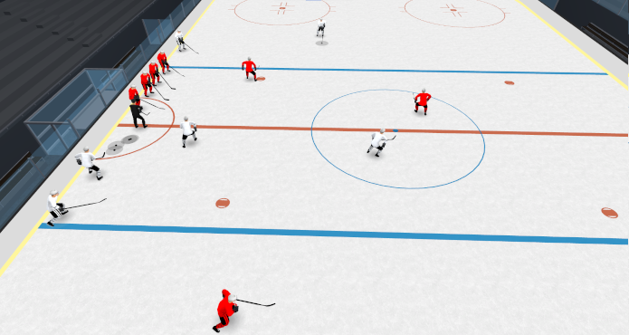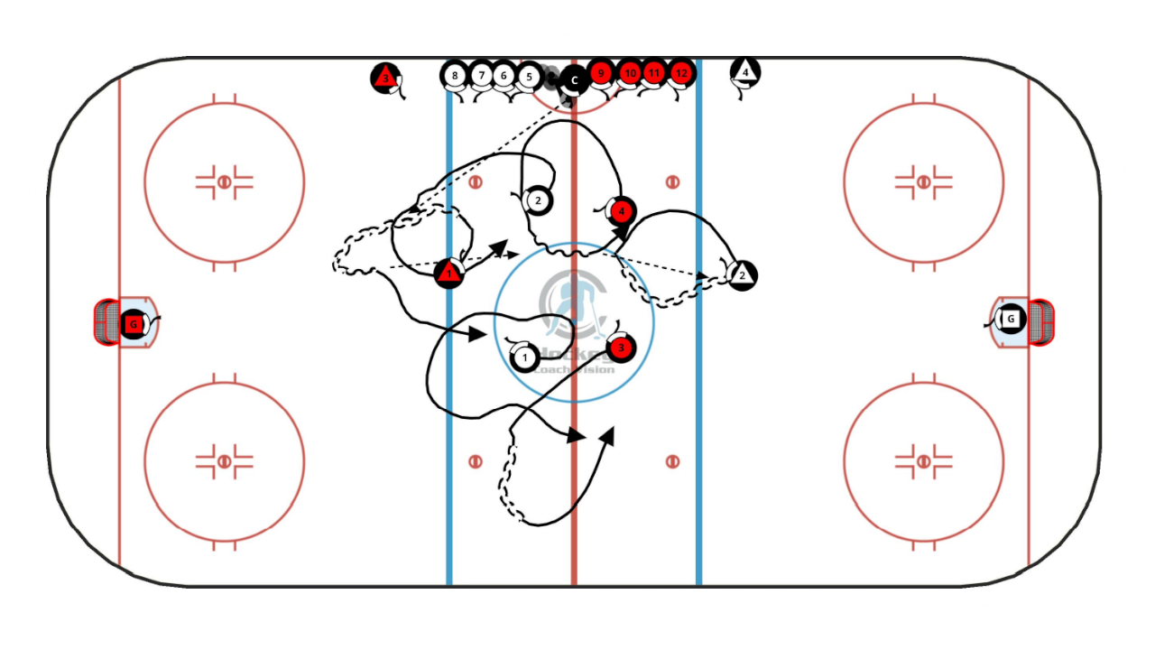 This is a drill to work neutral zone counterplay for both defenders and attackers. Forwards get to apply checking pressure as well as read the checking pressure of the other forwards once they transition to attack.