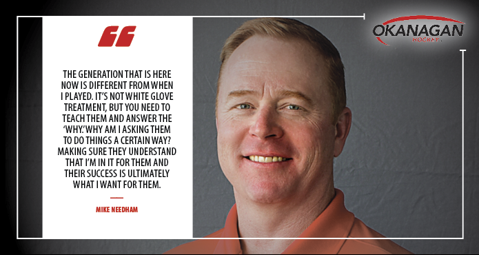 “I’ve always been involved in the game, I love hockey,” Needham regals. “I missed the competitive side and the teaching side and I did coach a bit while my son was playing in Penticton and I got the itch back and I thought this was a really good opportunity in a real quality environment where you can have a big impact on these players’ lives.”