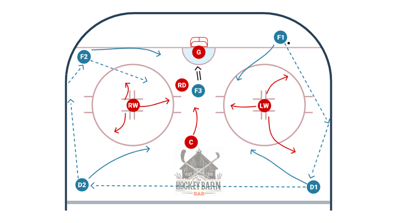 The offense sets up around the zone, with the F1 holding the puck below the goal line in the corner.