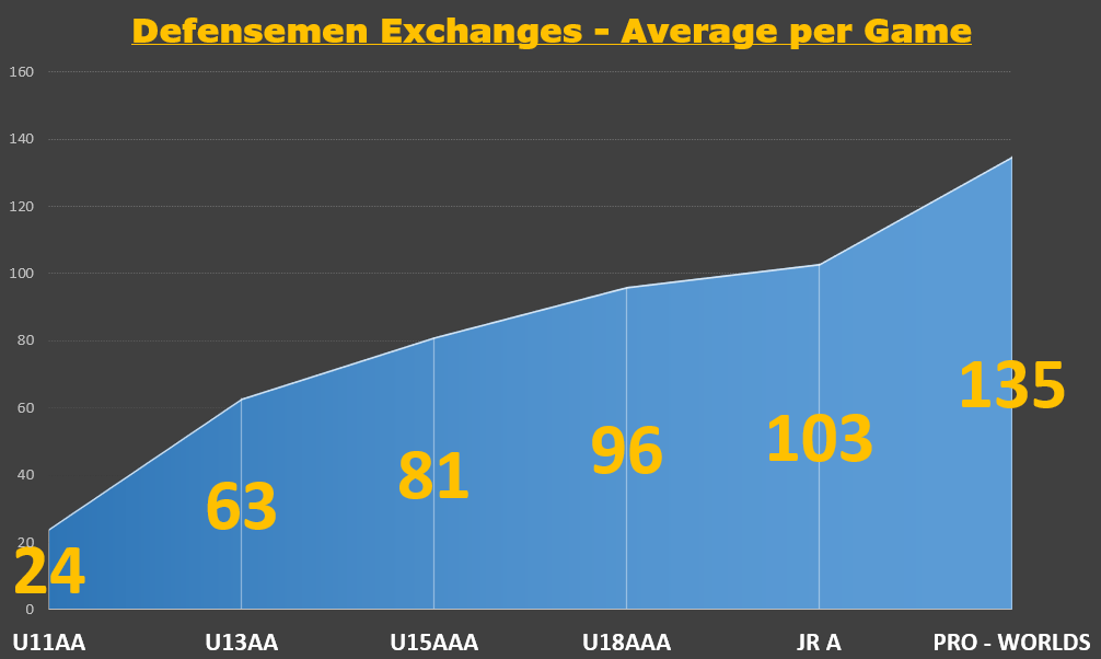 The chart shows an obvious correlation between the age/skill of the athletes vs the number of exchanges. In all of the games tracked there were no anomolies...the number of exchanges increased/decreased in relation to the age division. In each game tracked the team with more exchanges was the winner, however there are numerous factors in play here, a higher skilled team will generally move the puck more efficiently. The number of exchanges could simply be a by product of having higher skilled players or even better coaching with a puck possesion focus. The goal of the study was to help coaches believe that exchanges (specifically overs) are not something to avoid due to the risk of getting a pass picked off, but to teach your defensemen how to read the ice, communicate, stagger and be a good outlet for your partner at all times (puck support).
