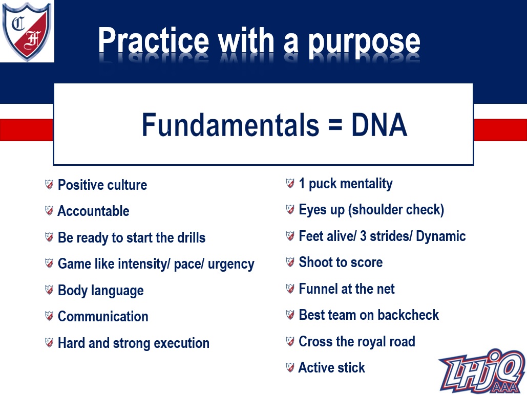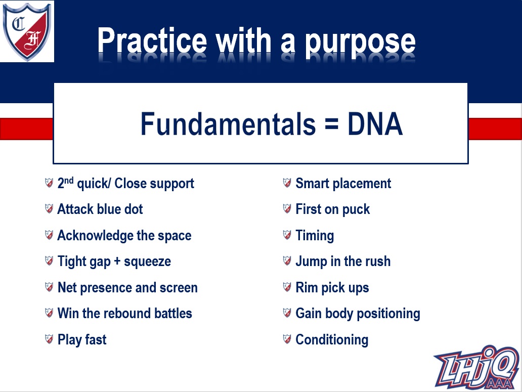 Now, everyone doesn’t have the same fundamentals and that’s fine. It’s your motto, not somebody else motto. Having too much can be a nightmare as well. In the picture below, a friend of mine who won the NAPA Cup in Qc Jr.A League and finish 4th at the Centennial Cup was willing to share with me his three slides of his fundamentals. With that, he adds videos for each of them when he explains drills. He always refers to them. You now can too.