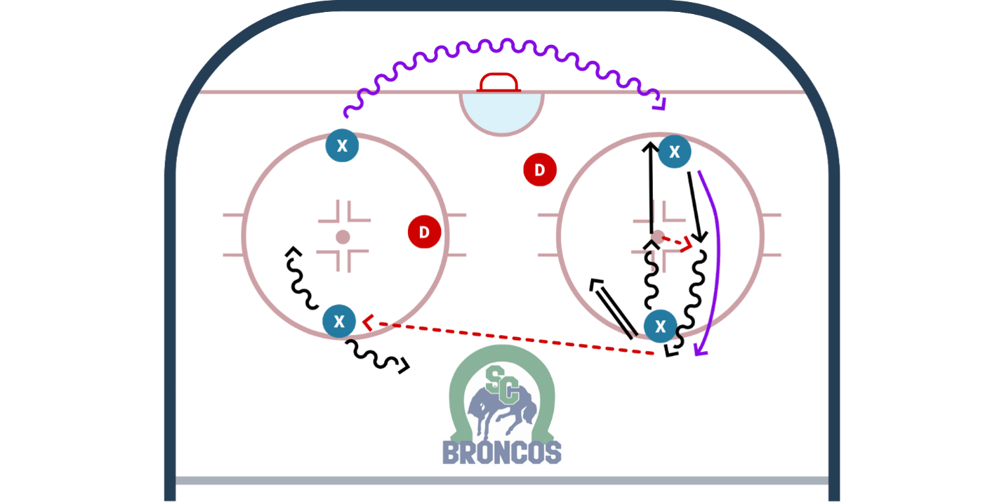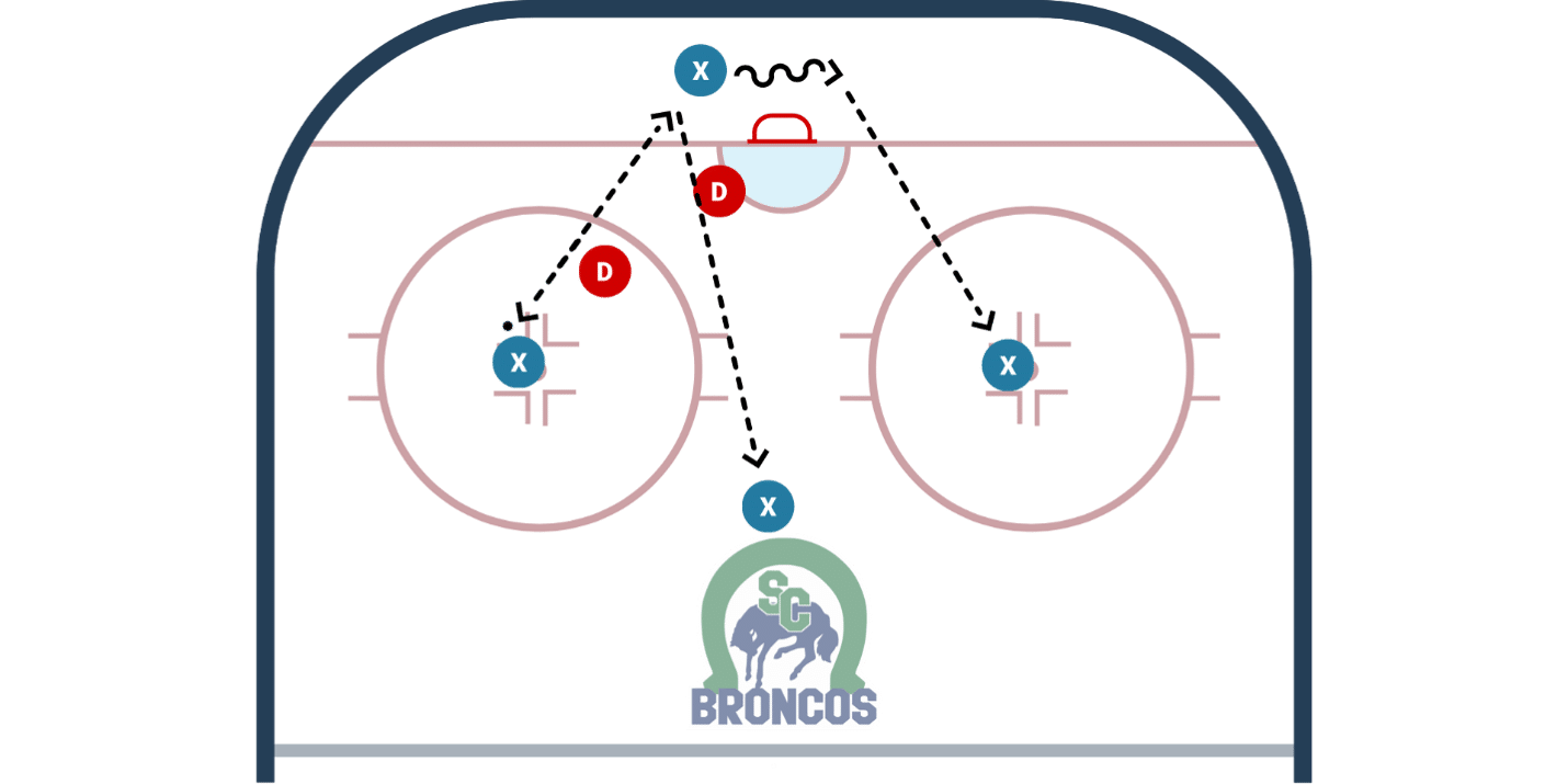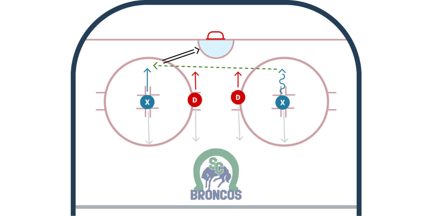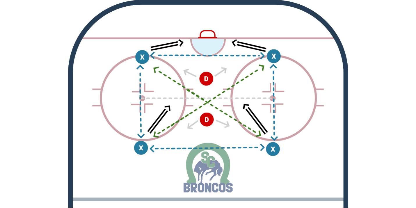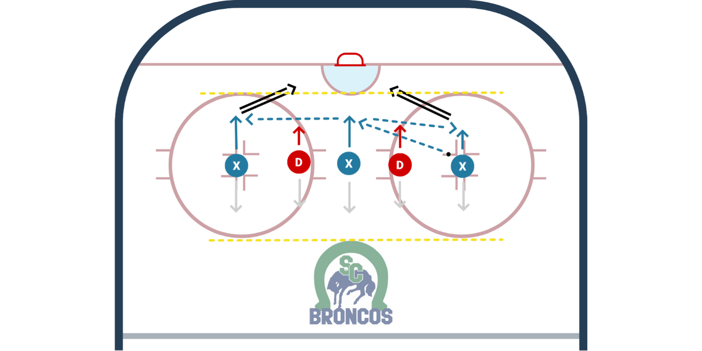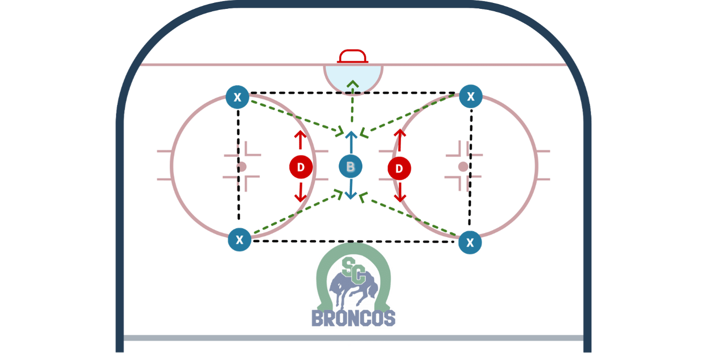 • Coach gives Flank a pass. They must hit the Bumper who is responsible for re-distributing the puck to either Flank and then shoot.