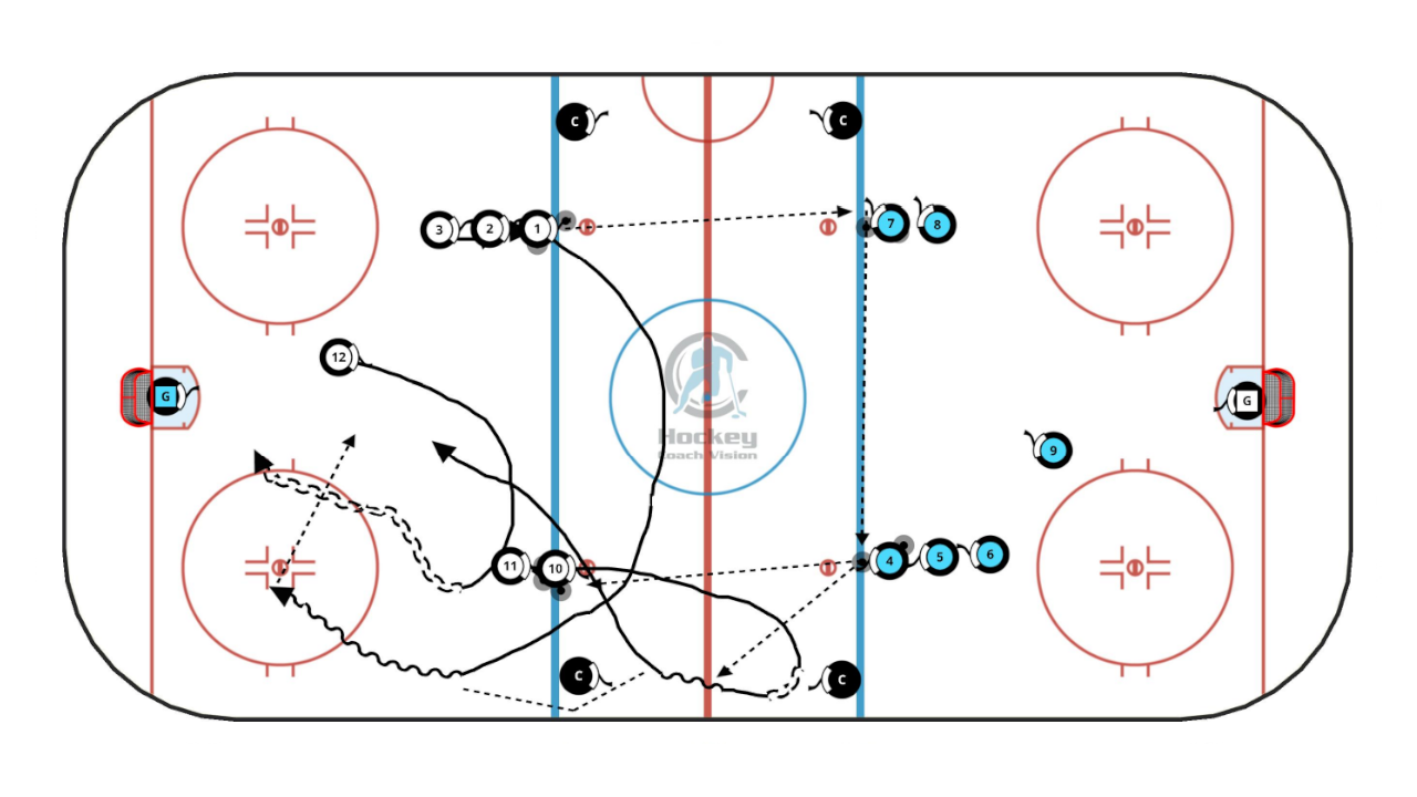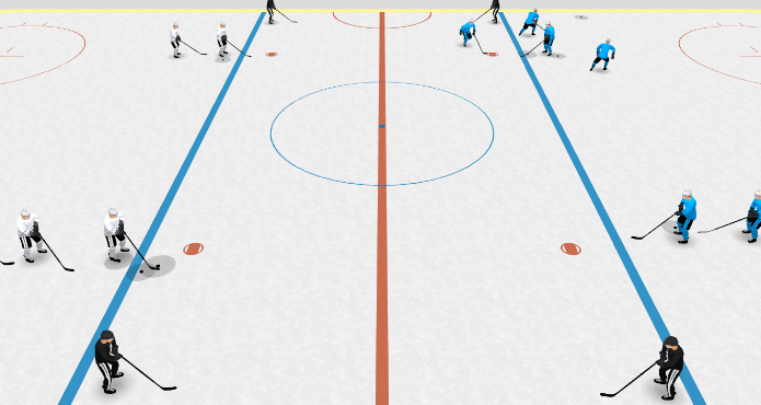 Great drill for working on offensive entries using a chip pass off of the boards. Timing is crucial on this one, so forwards must read the defenders and the forward before accelerating into the offensive zone for the chip pass.