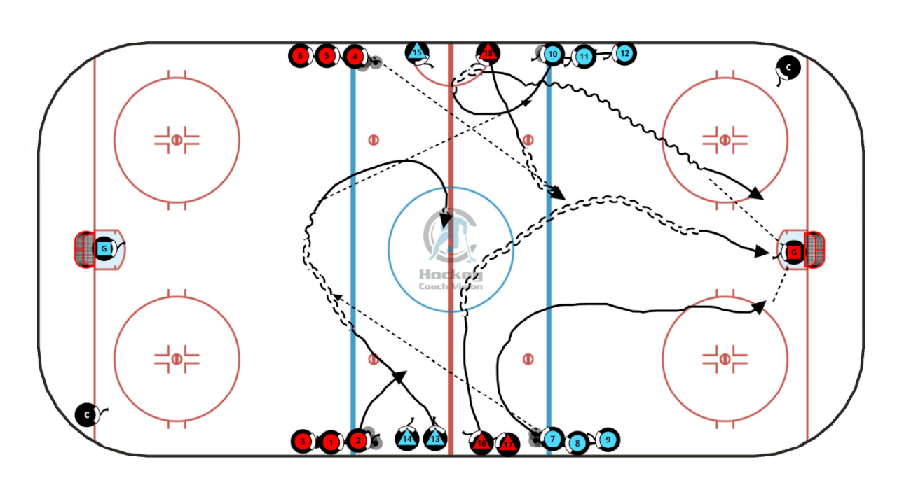 - Forwards should always pass to Dman coming off of the boards closest to him to simulate neutral zone quick transition.