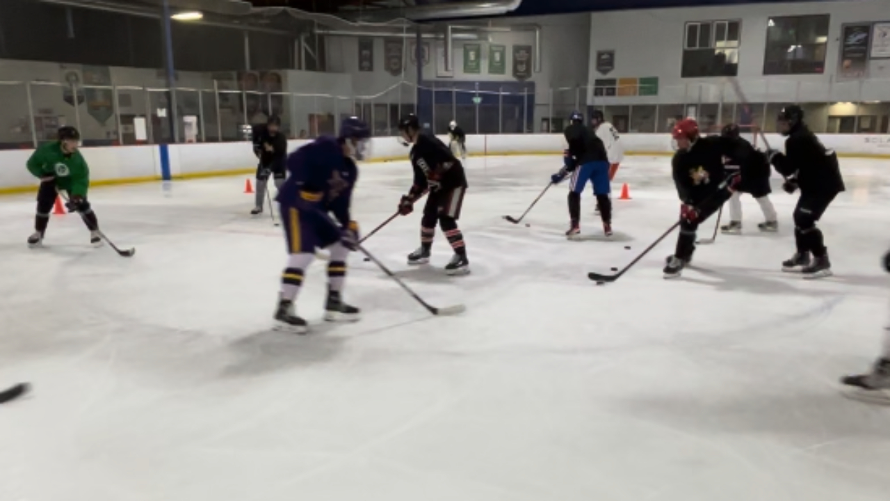 Now recently, while putting on a local clinic with some coaches, we added a new element. After the players complete their laps, they go to the center ice circle for a fun game of knockout. After surviving the chaos, they now need to survive attacks against the puck they have. Last player standing wins.