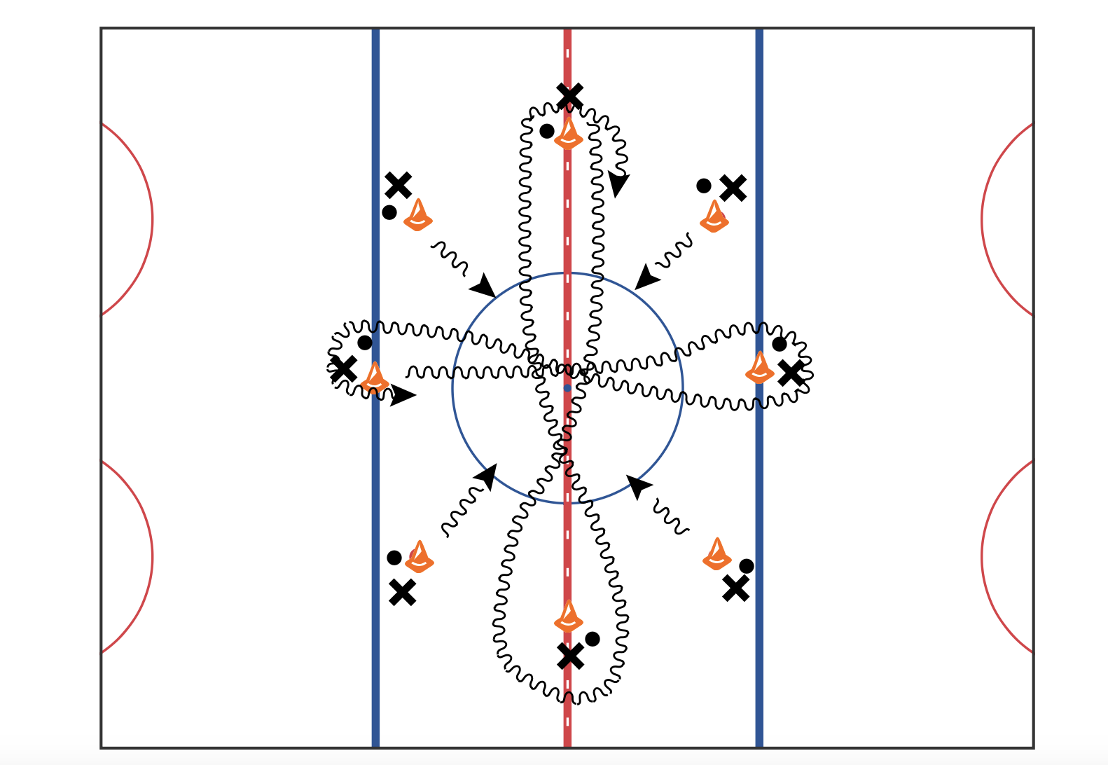This worked well with a chaos stickhandling drill I have been doing for a few years now, which 8 skaters go from cone to cone in a figure at all at the same time. You can do this without pucks and with pucks to get them used to it.