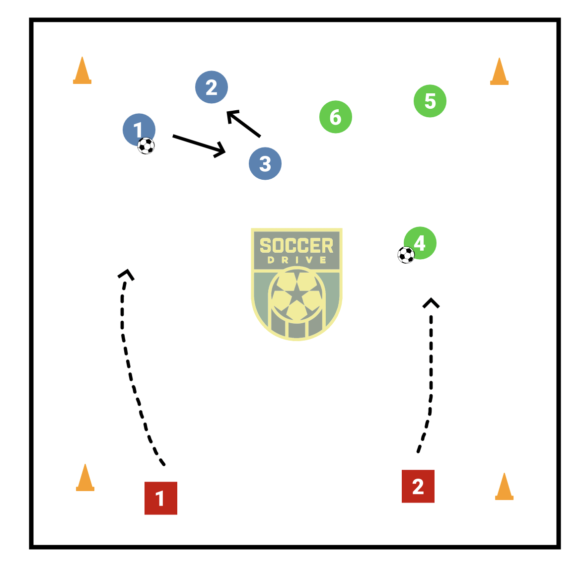 In the soccer drill, there are 2 teams of 3 each with their own ball (you can add more balls to the game to make it harder if the taggers are doing too well), and then 2 taggers who are trying to eliminate the team. Cone off an area on the pitch to ensure they don't have too much room to move around.
