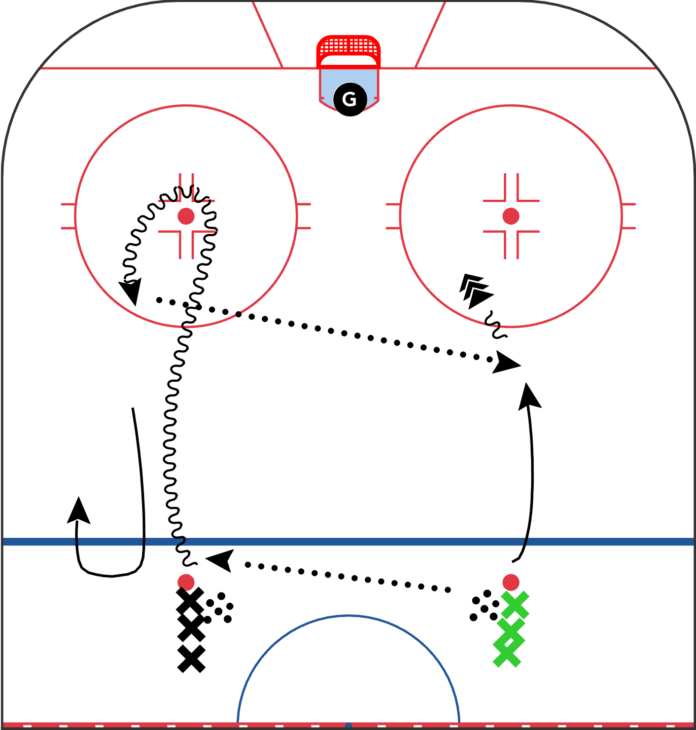 - Other line buys ice, scans, and accelerates into pass and shoots without stickhandling