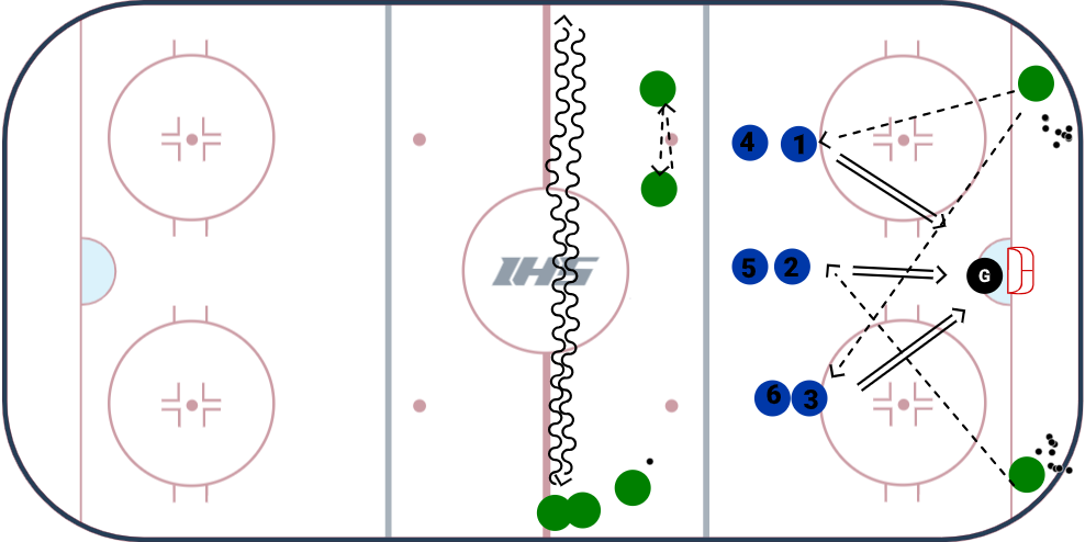 Group 1 shooters are coloured blue in the diagram, group 2 shooters are coloured green. On our team, forward lines 1 and 2 were always our group 1 shooters, while forward line 3 and our D were our group 2 shooters.