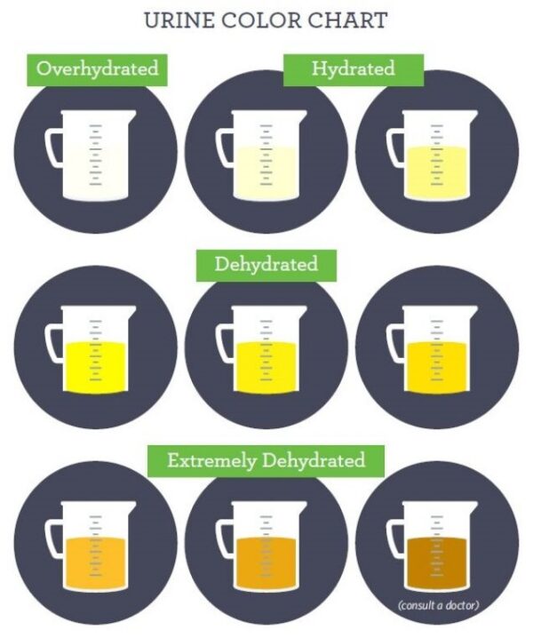 Since the body is predominantly water and performance during a game can be enhanced by being properly hydrated, it makes good sense to focus on drinking fluid before, during, and after games. Fluids can come from many sources: water, sports drinks, and food (before and after games). A good indicator of players being properly hydrated is their urine will have a slight yellow colour to it.