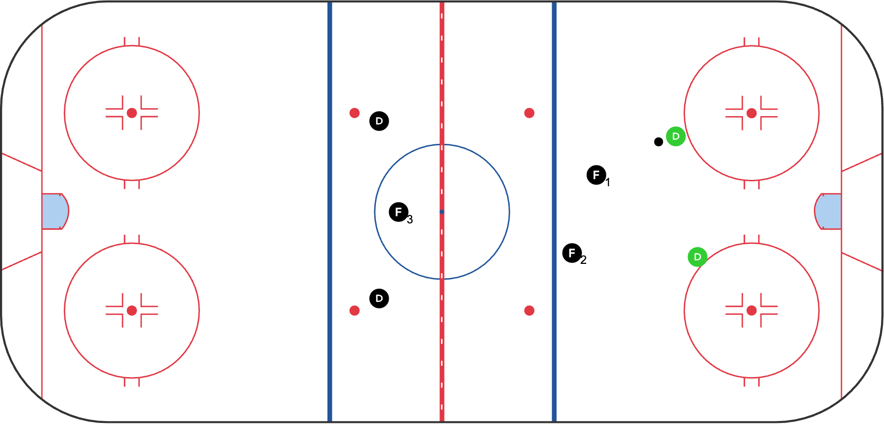 - The three-player barrier (F3, D1, and D2) forms a tight, coordinated unit that shifts based on where the forecheckers are steering the play