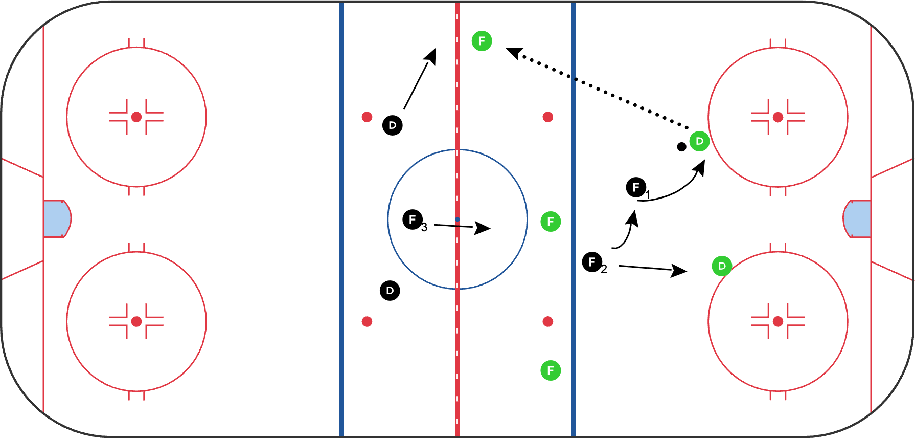 The F3, D1, and D2 form a line across the neutral zone. This three-player barrier typically aligns themselves between the red line defensive blue line. Their positioning must be fluid and coordinated, shifting as a unit based on where F1 and F2 are steering the play.