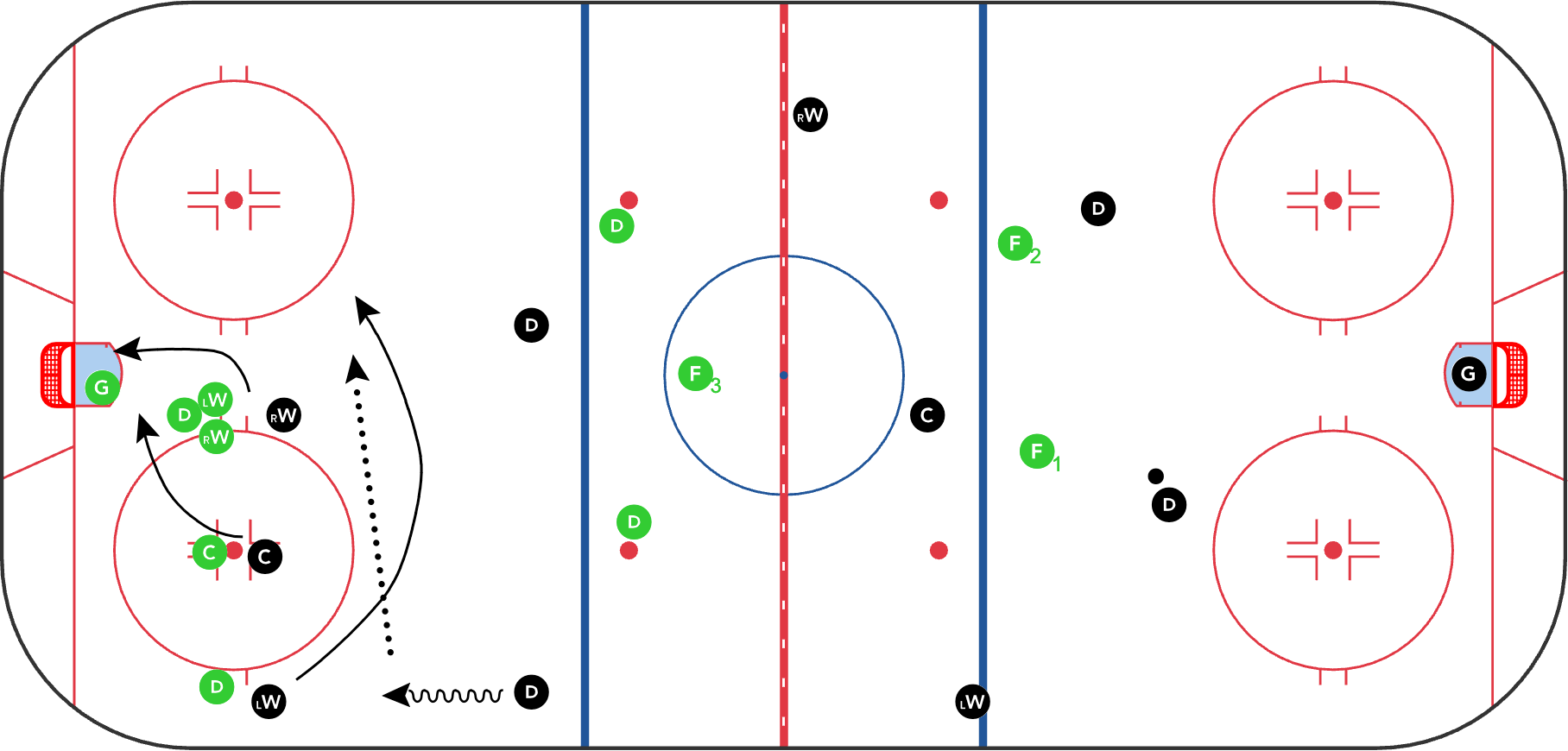 Here’s a drill you can use to practice this forecheck. It starts with a faceoff win, so your players will really be primed for a game-like situation.