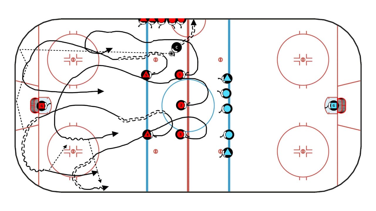 Oilers Breakout and Counter is a great drill to use early in practice to work on breakouts, neutral zone counters against the trap and neutral zone defence.