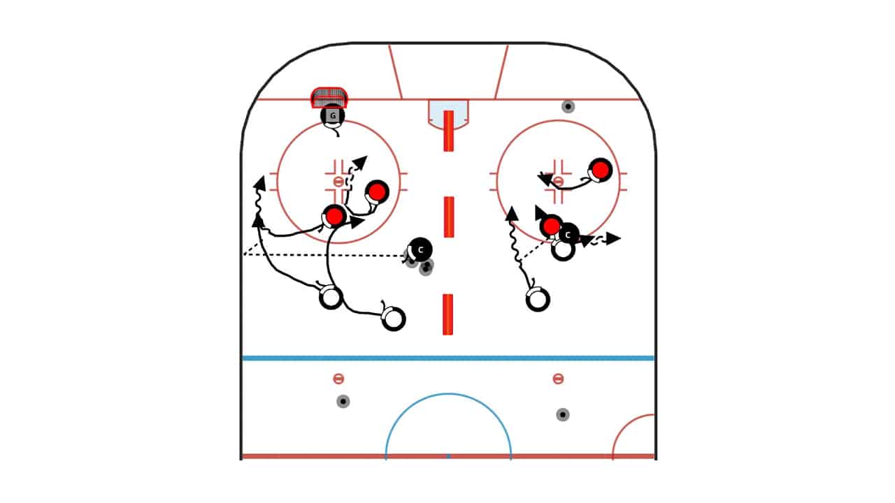 In a small ice zone, 2v2 or 3v3 tire hockey with a coach outlet pass option. The team with puck possession can use the coach as an outlet as often as presented creating a 3v2. As the team puck possession changes, so do the outlet pass option to the coach.