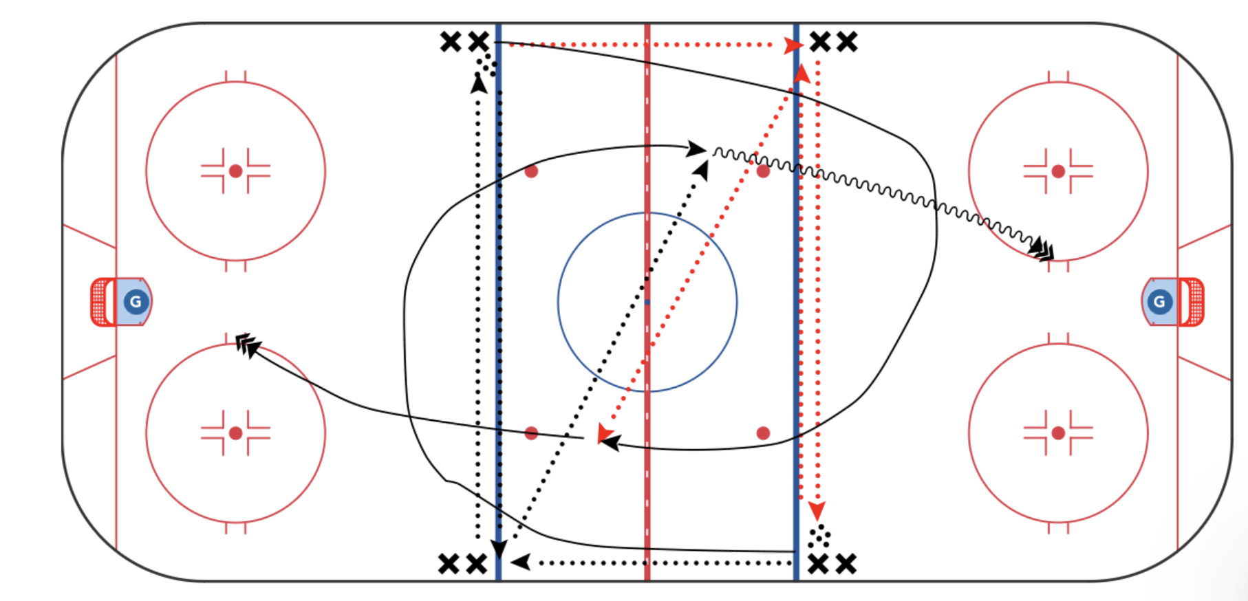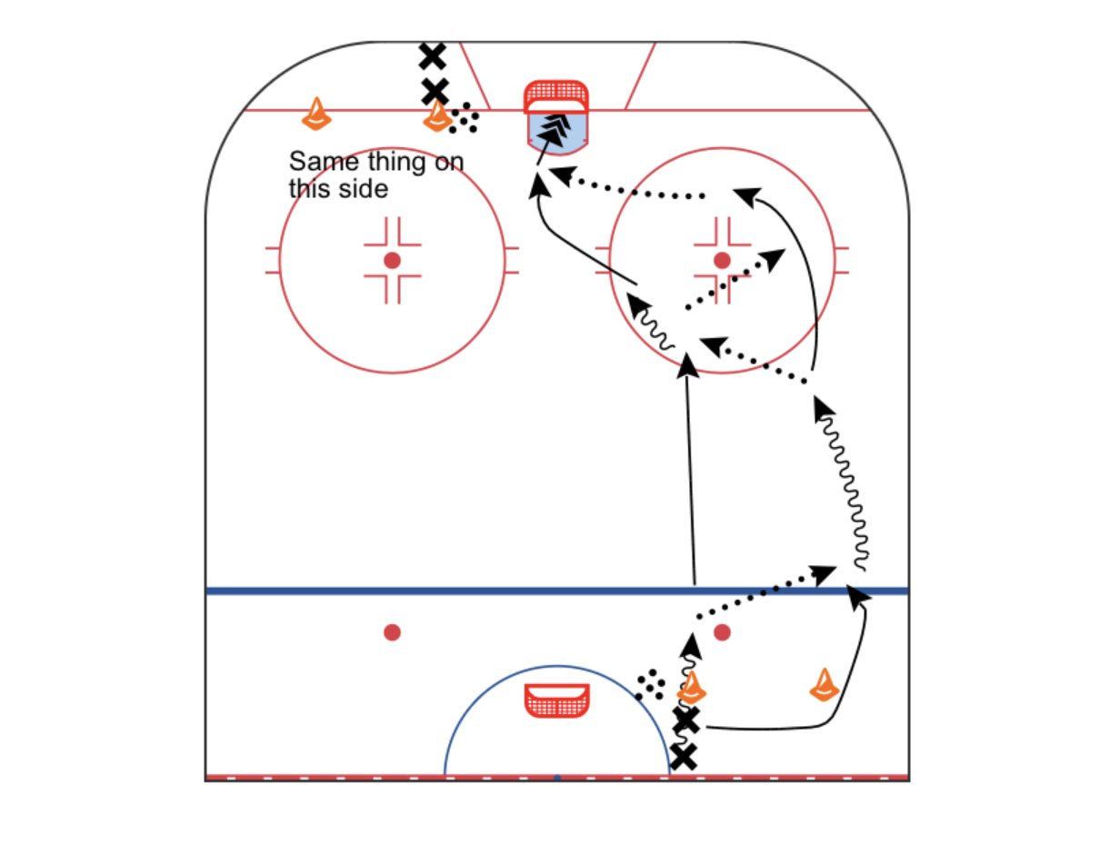 This runs both sides at the same time and sees two opposite forwards leave the blueline and pass to a player directly in front of them. Those two players receiving the pass then quickly pass the puck to their opposing player along the same blue line while the original skaters head deep into the zone, circling out back towards the neutral zone.