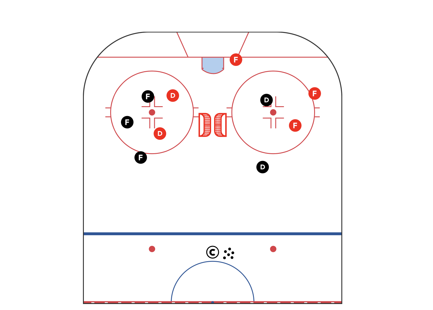 In this drills, you put 2 teams on the ice, and assign them a side, players cannot cross over from one side to the other. The black team will have 3 forwards on one side, and 2 defenders on the other, while the red team will do the same.