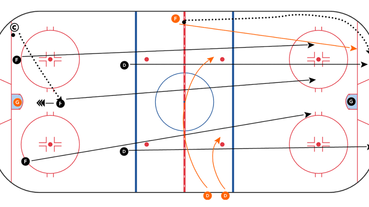 We always start this drill running one our OZ sets 5v0 focusing on quick passes and good puck support in the OZ while working on specific OZ sets