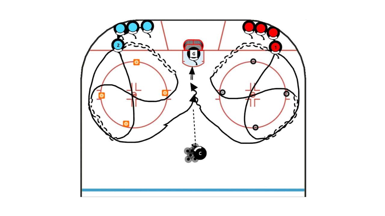 Power X Race is a great competitive hockey drill to work on quick turns, pivoting, puck protection, and scoring under pressure.