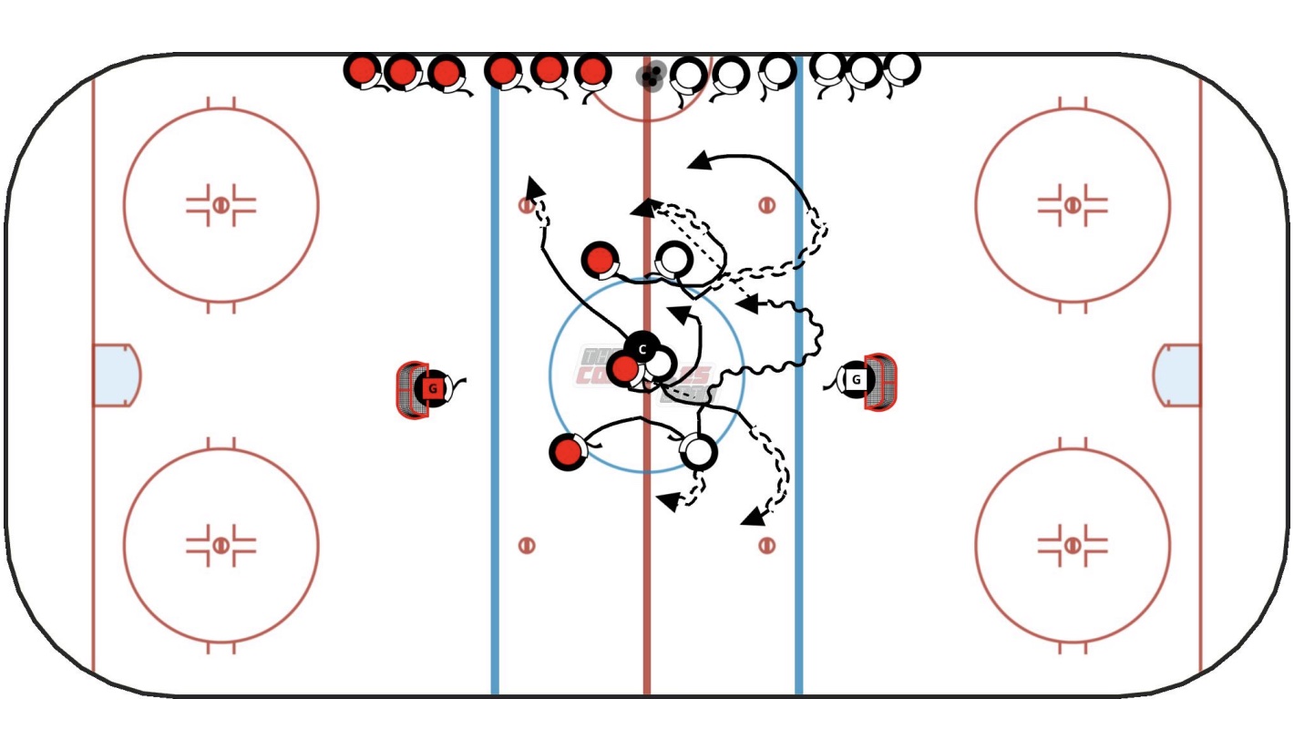 3v3 small area game with nets set just below blue lines in offensive zones. Red line is used as off side for both teams. When defensive team regains the puck, player passes to one of the three players in line along the wall to activate player. Passer switches out and another player moves into position on the wall. On a goal or whistle, switch in 3 new players on both sides.