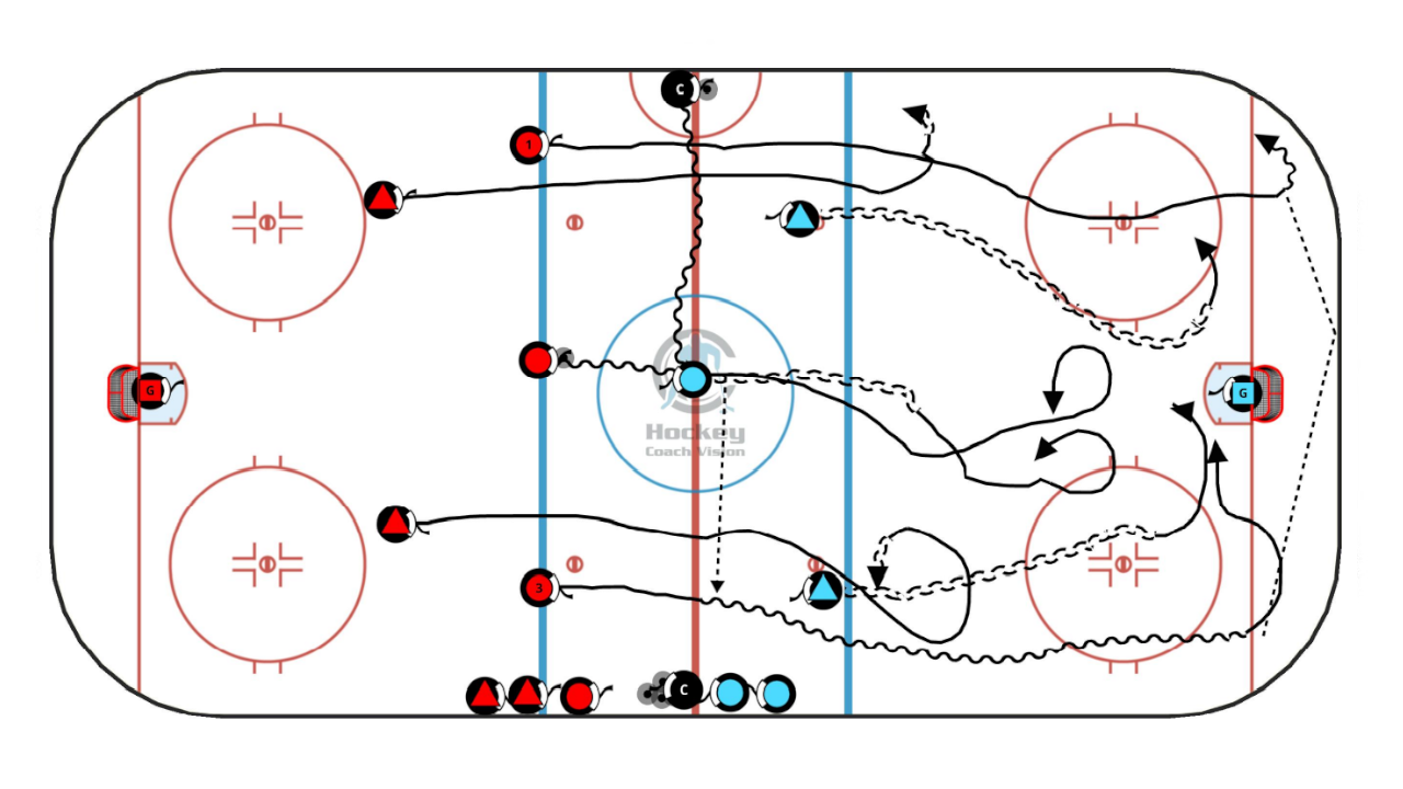 • On whistle, Coach chips puck behind offensive Dman who retrieves it and rims it back in hard.