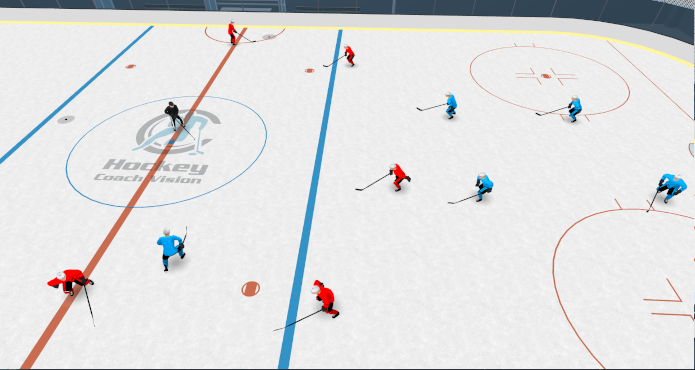 • Next whistle, Coach chips another puck, D man rims, last defender jumps in, Forwards clear and attack 5vs5.