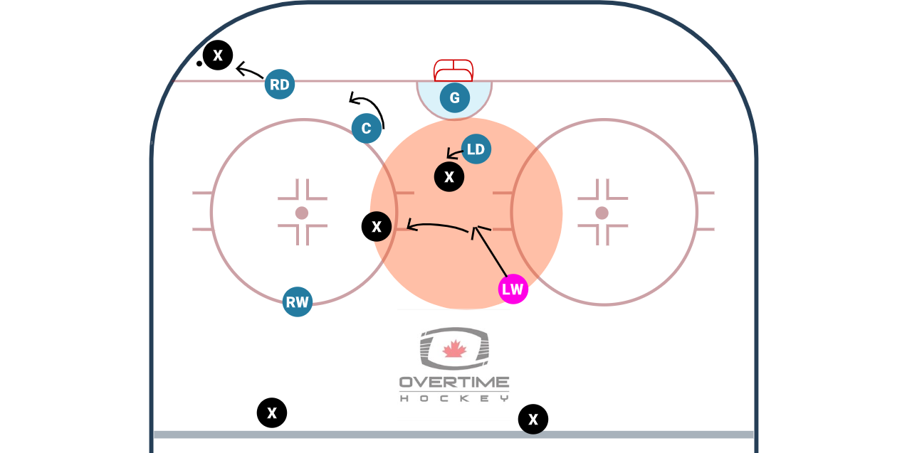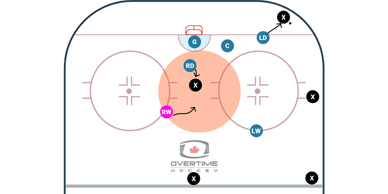 Providing support in the house is important especially at the younger ages when there is not a ton of threat from the point. With the older ages, we assume our players are strong enough skaters to get from the house out to the point so the threat of the open point is outweighed by the threat from the house. Whether the opponent is playing an Overload where that F2 would be along the wall or a potential 3 High like this image is starting to show, out numbering the opponent in the house is the goal of this set up.