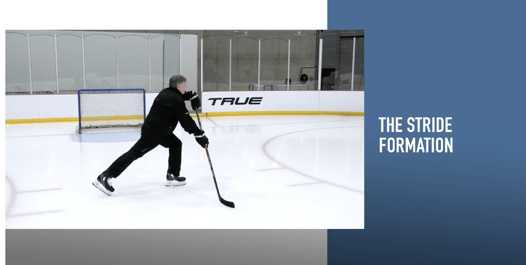 Stride formation is the classic hockey wrist shot - weight on the front foot, under the top hand, back foot back and pushing power into the shot. Even though it's a classic, a lot of players have neglected to practice it as they get older because it's easier to lean on their fancy hockey sticks to whip and torque. That's fine, but they're missing out on an important piece of the shooting arsenal. Watch the clips above with this image in mind!