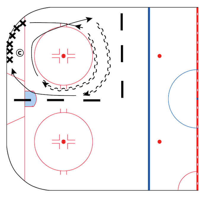 Coach directs player to the circle. Player skates hard to gain speed then pivots into a glide backwards at the top of the circle.